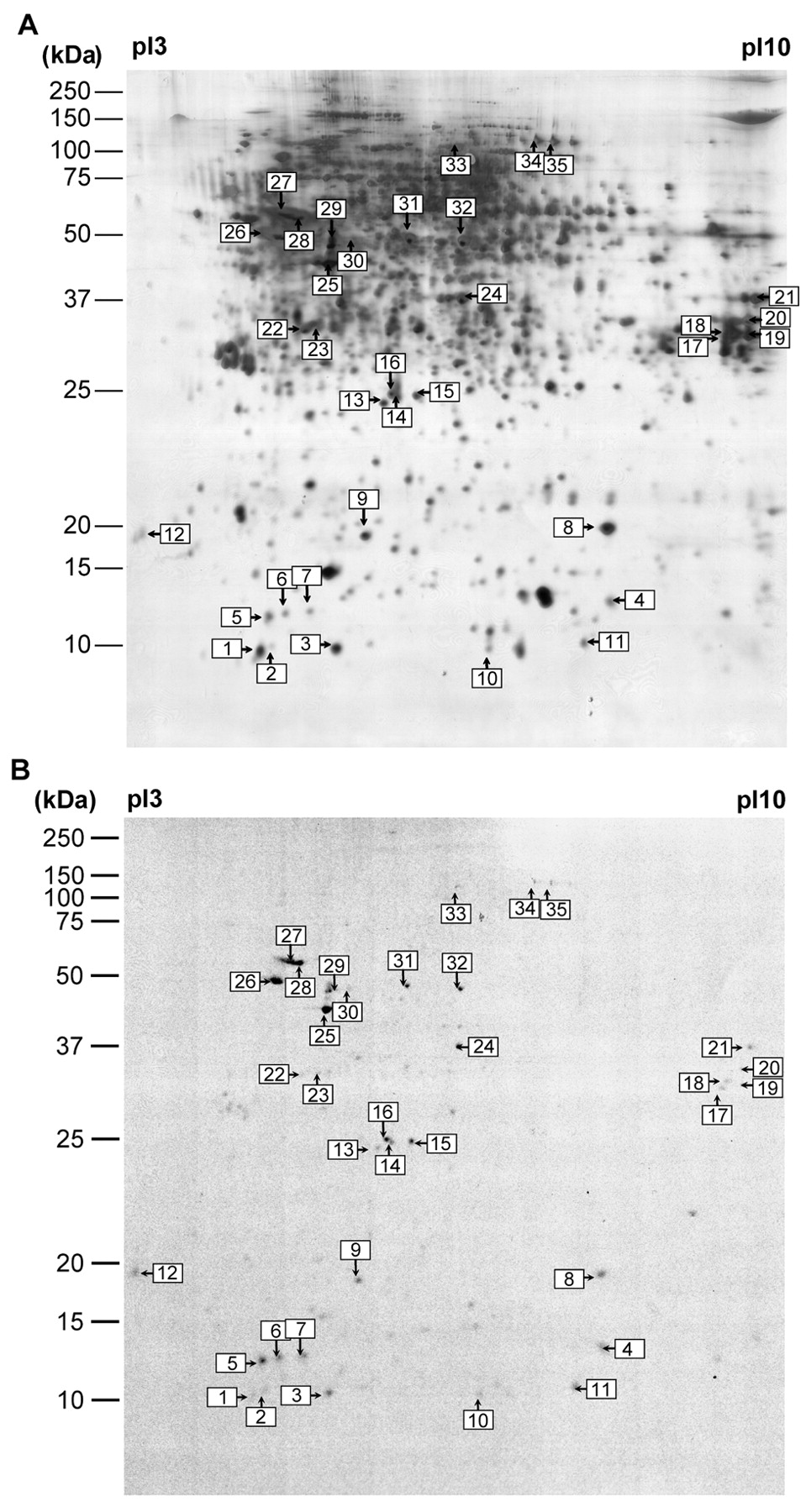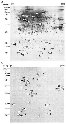 Retrograde axonal transport of proteins in vitro. (A,B) Representative 2-DE separation of proteins from DRG after culture in compartmentalized culture dishes with the end of the peripheral nerve incubated with [35S]methionine-[35S]cysteine for 2 days. In the autoradiograph of the gel shown in A, up to 100 radioactive spots are visible, of which â¼35 (arrows) were also seen in autoradiographs of gels from other experiments. The silver-stained gel in B showns many more spots, of which only a small subset correspond to those on the autoradiograph (arrows).