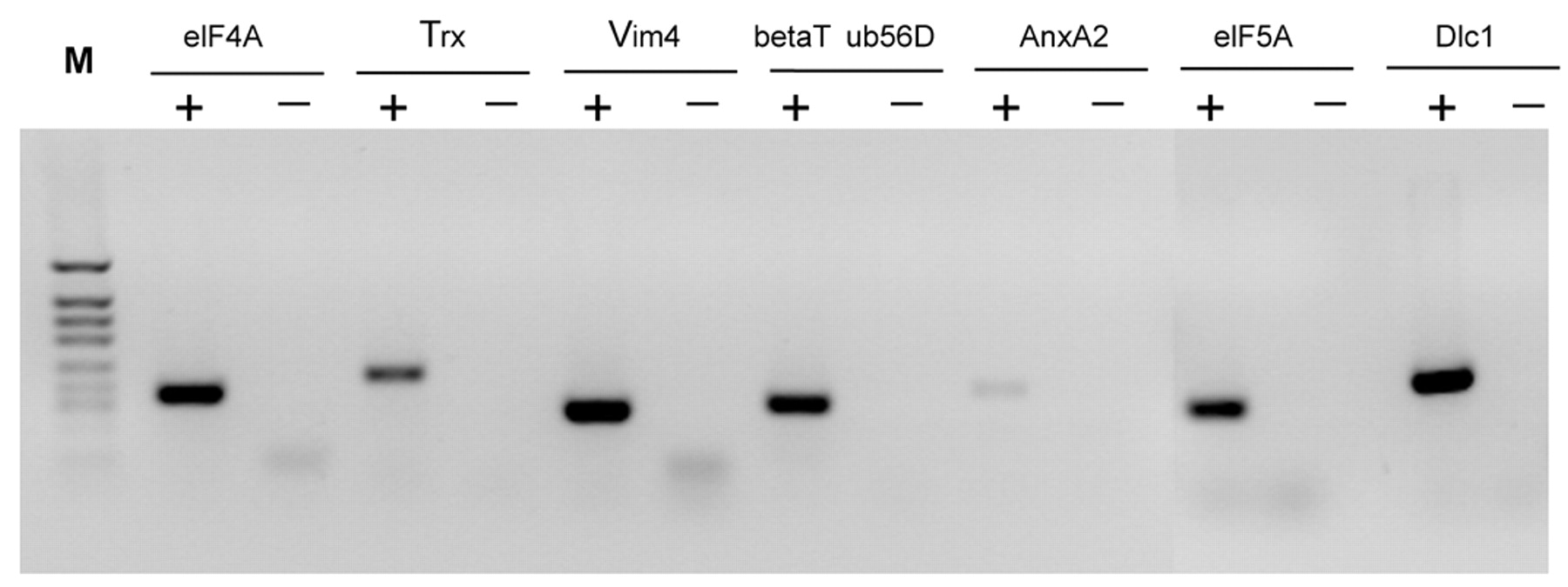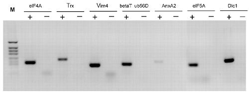 Detection of axonal mRNAs by RT-PCR. Seven representative retrogradely transported axonal proteins that comprise elongation-initiation factor 4A (eIF4A), elongation-initiation factor 5A (eIF5A), Trx, vimentin 4 (Vim4), β-tubulin at 56 D (betaTub56D), calpactin 1 light chain (AnxA2), and dynein light chain 1 (Dlc1) were selected to determine whether their corresponding transcripts were present in axonal RNA extracts using primers described in Table 1. The predicted sizes of the amplified products of these cDNAs are 175, 163, 226, 150, 163, 200 and 223 bp respectively. Although there is variability in the levels of each of the amplicons, expression can be seen in each case (+). No products were amplified when reverse transcriptase was omitted from the reactions (â). M, HpaII-digested Bluescript vector as a size marker.