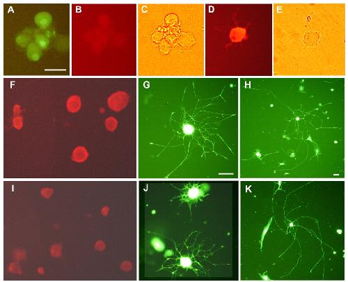 MO targeting Trx reduces neurite outgrowth from dissociated DRG neurons. (A-H), dissociated DRG neurons nucleofected with carboxyfluorescein-labelled β-globin MO. Images shown in A, B or C represent the same field of cells viewed using FITC, TRITC filters or phase contrast, respectively. (A) Most of the cells are carboxyfluorescein-positive and, although signal has preferentially accumulated in the nucleus, extensive fluorescence is also associated with the cytoplasm. (B) Non-specific labelling with TRITC-conjugated anti-rabbit IgG (in the absence of primary antibody), serving as a control for (D) which is immunostained for Trx. (E) is a phase-contrast image of (D). (F), β-globin MO nucleoporated DRG neurons immunostained for Trx. (G,H), lower magnification images labelled with Calcein of freshly dissected (G) or conditioned (H) DRG neurons. (I-K) Images equivalent to those shown in F-H, but neurons were electroporated with a Trx MO. Note that immunofluorescence of Trx is reduced in the Trx MO-treated neurons and also that in this latter case the extent of neurite outgrowth is significantly reduced in freshly dissociated (but not conditioned) neurons. Scale bars, 50 μm. Magnifications of A-F and I, G and J, H and K are identical.