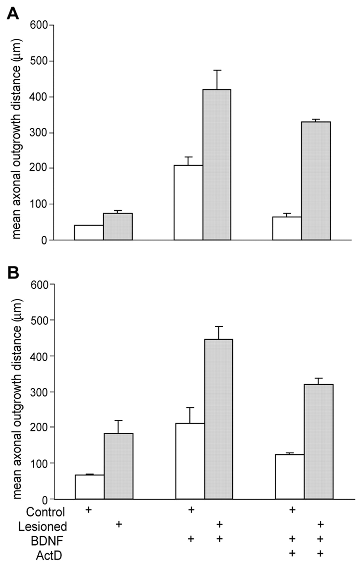 In vivo conditioned PN-DRG show enhanced BDNF-induced axonal outgrowth in the presence or absence of ActD. (A,B) Mean axonal outgrowth distances from (A) 3-day or (B) 5-day in vivo conditioned PN-DRG (hatched bars) and contralateral controls (open bars) after 3 days in collagen gels. BDNF enhances axonal outgrowth from control PN-DRG, but this response is greatly reduced by ActD. In vivo conditioned preparations show enhanced spontaneous and BDNF-induced axonal growth, even in the presence of ActD.