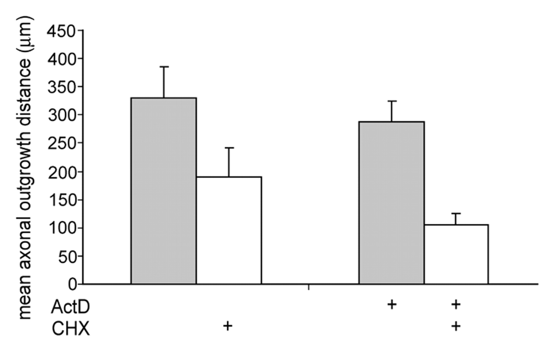 In vitro conditioning is impaired by inhibition of protein synthesis in the peripheral nerve. PN-DRG were incubated for 3 days in compartmentalized culture dishes, with the end of the peripheral nerve in the inner compartment (with or without CHX), prior to culturing the DRG and proximal part of the peripheral nerve (which had not been exposed to CHX) in collagen gels with BDNF (with or without ActD). Protein synthesis inhibition in the peripheral nerve significantly reduced subsequent BDNF-induced axonal outgrowth in the presence of ActD.