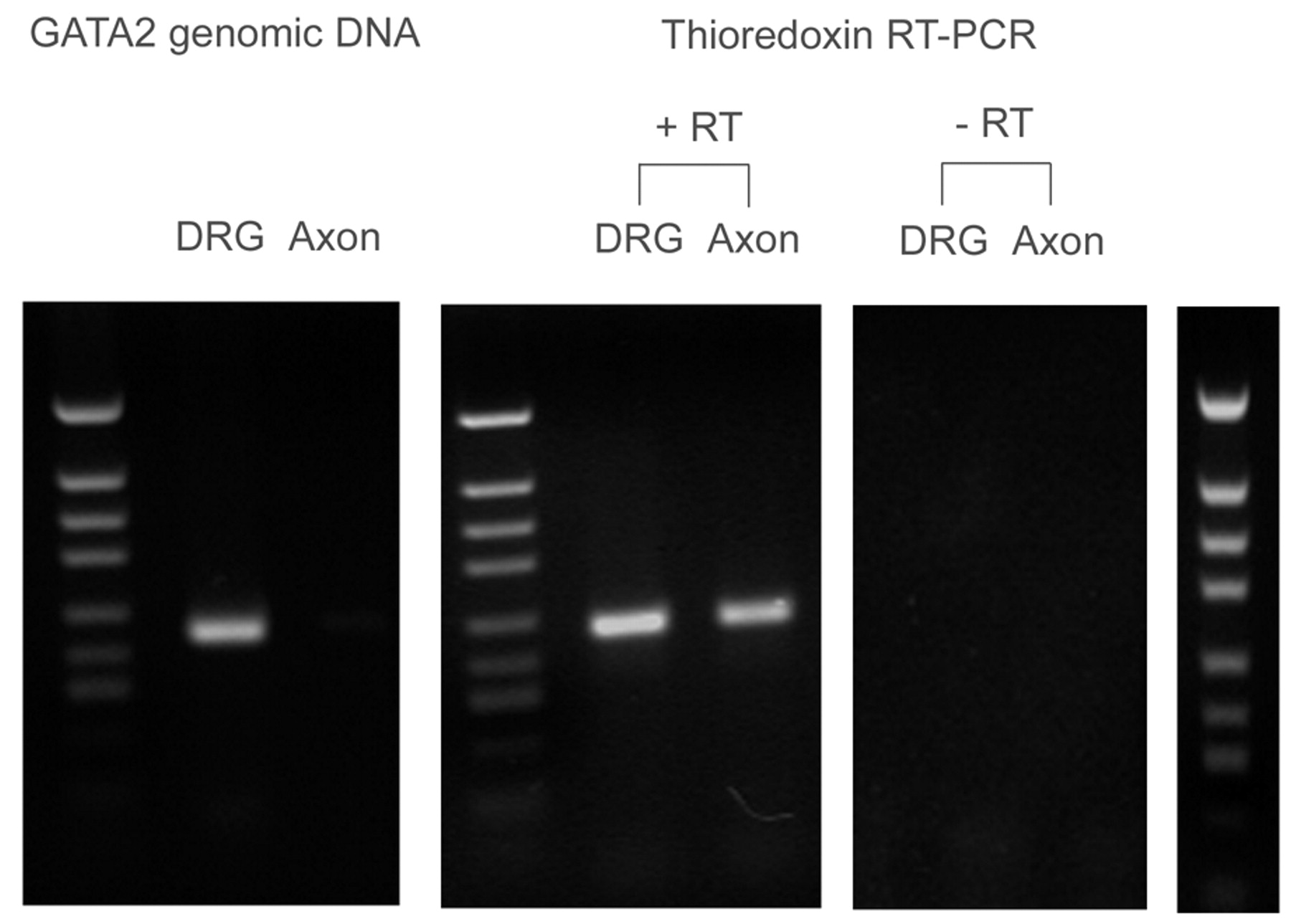 Absence of cellular contamination of axonal RNA samples. Agarose gel stained with ethidium bromide. A strong signal for GATA2 genomic sequence is seen in the DRG samples only. By contrast, Trx can readily be detected in cDNA prepared from both DRG and axonal samples (+RT). The predicted sizes for GATA2 and Trx amplicons are 216 bp and 226 bp, respectively. No products were amplified when reverse transcriptase was omitted from the reactions (â). Lanes at the edges of the figure represent HpaII-digested Bluescript vector as a size marker.