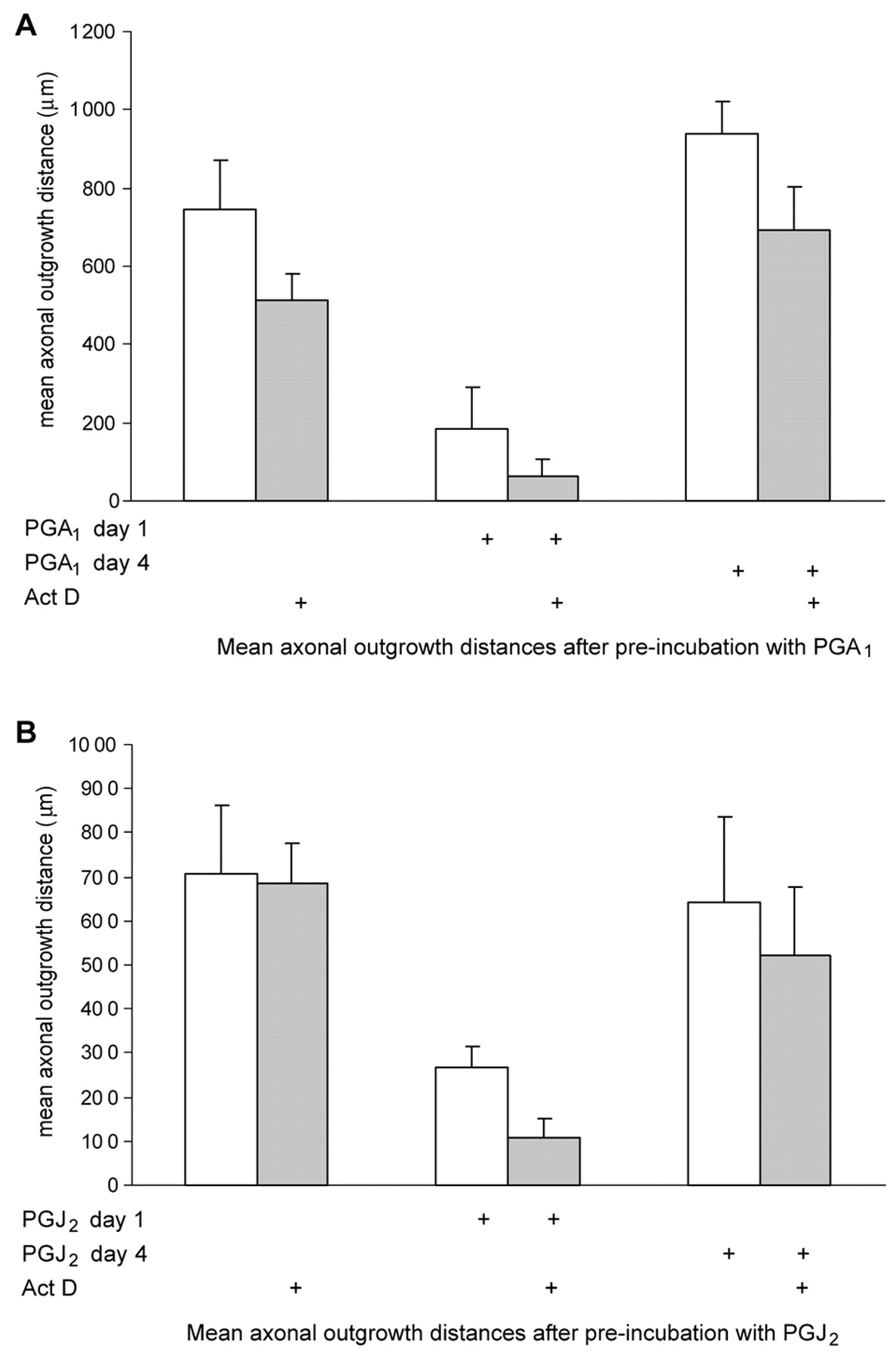 The in vitro conditioning effect on axonal growth is blocked by cyclopentenone prostaglandins. (A,B) PN-DRG were incubated for 4 days (free-floating) with either PGA1 (A) or 15d-PGJ2 (B) present on day 1, day 4 or not present prior to incubation in gels for 3 days with BDNF. Incubation with the prostaglandins on day 1 strongly inhibited subsequent BDNF-induced axonal growth (in the presence or absence of ActD), but not if added on day 4.
