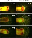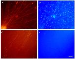 Isolated axon preparations. (A-D) BDNF-stimulated axonal growth, visualized by Calcein Orange-Red fluorescence (A) is associated with migrating cells whose nuclei are labeled by DAPI (B). Axons that have extended through a Nuclepore membrane (C) are devoid of migrating cells (D). The bright foci that are visible in C represent localized thickenings of axons, not cells, as shown by the absence of DAPI labeling in D. Scale bar, 100 μm.