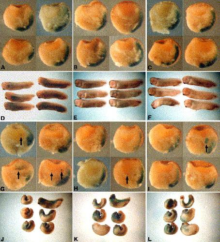 Fig. 3. Over-expression of Bcl-2 in PDGFR-37-injected embryos rescues the cell death but not gastrulation movements of mesoderm cells. Embryos that received mRNAs encoding β-gal-NLS and (A, D) PDGFR-FS, (G) Bcl-2, (B, E, H) PDGFR-37, or (C, F, I) Bcl-2/PDGFR-37 at a 10:1 ratio at the 2- to 4-cell stage were fixed and stained for β-gal at stages (AâC) 11 and (DâI) 26. Note the presence of cells with diffuse β-gal staining in the blastocoel of PDGFR-37-injected embryos (B, arrows; a mild phenotype is shownâsee Fig. 4 for severe PDGFR-37 phenotypes) and their absence in Bcl-2/PDGFR-37-injected embryos (C) at stage 11. Also note the presence of lumps along the dorsal axis of Bcl-2/PDGFR-37-injected embryos at the tailbud stage (F, arrowheads). Gastrula-staged embryos are oriented animal up, dorsoanterior right.