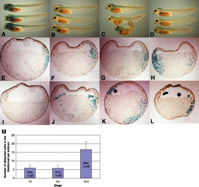 Fig. 1. Inhibition of PDGFR signaling causes mesoderm cells to accumulate in the blastocoel cavity at the beginning of gastrulation. Xenopus embryos co-injected at the 2- to 4-cell stage with β-gal-NLS mRNA and one of the following mRNAs: (A, EâH) PDGFR-FS, (B) XPDGFRα, (C, IâL) PDGFR-37, or (D) XPDGFRα/PDGFR-37 at a 10:1 ratio. Embryos are assessed at stages (AâD) 41, (E, I) 9, (F, J) 10, (G, K) 10+, and (H, L) 10.5. (A) PDGFR-FS- and (B) XPDGFRα-injected embryos develop normally. (C) PDGFR-37-injected embryos develop with gastrulation-specific defects. An example of a normal, mild, and severe phenotype is shown (C). (D) These defects are rescued by over-expression of wild-type XPDGFRα. (IâL) When assessed earlier in development, mesoderm cells with diffuse β-gal staining are found to appear in the blastocoel cavity of PDGFR-37-injected embryos beginning at stage 10. (EâH) At all stages, PDGFR-FS-injected embryos develop normally, and their mesoderm cells have nuclear β-gal staining. (M) The number of detached cells in the blastocoel cavity at stages 10, 10+, and 10.5 was assessed. Error bars represent standard error.