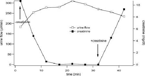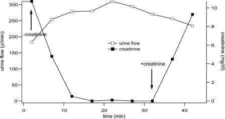 Figure 1. Urine flow and creatinine concentration in a kidney perfused at 5°C. Urine was collected from the left ureter. The perfusate initially contained 10 mg/dl creatinine, and the urine had a similar concentration. The perfusate was switched to a creatinine-free solution at t = 2 min and back to creatinine-containing solution at t = 32 min.