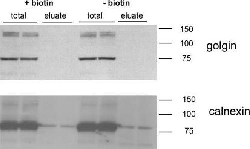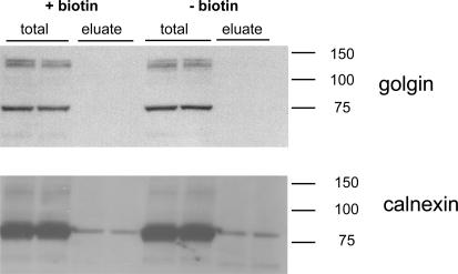 Figure 2. Absence of biotin labeling of intracellular membrane proteins. Kidneys were perfused with or without biotin. Lanes were loaded with 15 μg of total membrane protein or 20 μl of eluate from the neutravidin beads. Duplicate adjacent lanes represent separate material from each of two animals for each condition. The upper blot was stained with anti-golgin; the full length protein corresponds to the doublet of high apparent molecular mass. No staining of the eluates could be detected either with or without biotin. The lower blot was stained with anti-calnexin, which gave a very strong signal with the total membrane pool. Similar staining was observed with the eluates from kidneys perfused with or without biotin, indicating the absence of biotinylation of this protein. In these and subsequent blots, numbers to the right correspond to the positions of molecular mass standards in kD.