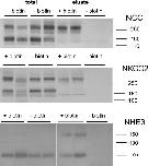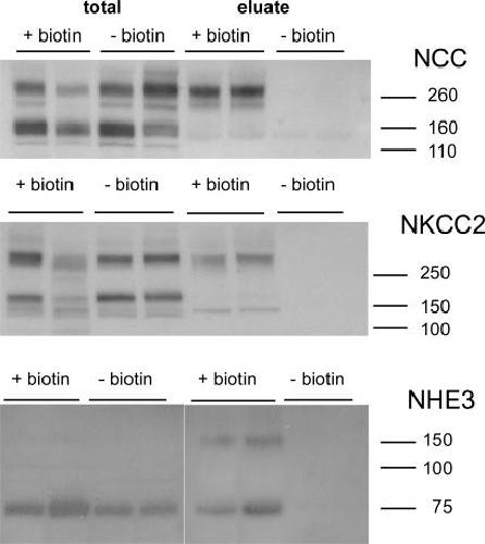 Figure 3. Biotinylation of plasma membrane proteins. Kidneys were perfused with or without biotin. Lanes were loaded with 45 μg of total membrane protein or 25 μl of eluate from the neutravidin beads. Top: Na/Cl cotransporter (NCC). In total membranes, the antibody reacted with proteins of apparent molecular masses of ∼130 and ∼260 kD, presumably reflecting monomeric and dimeric forms of the transporter. The material in the biotinylated eluate was mostly at the higher molecular mass. No staining was observed in the nonbiotinylated eluate. Middle: Na/K/2Cl cotransporter (NKCC2). Three bands were observed, with the major ones at ∼140 and ∼280 kD, again presumably reflecting monomeric and dimeric forms of the transporter. The sharper band at ∼110 kD may represent the nonglycosylated form of the protein. The eluate of the biotinylated kidneys contained primarily the 280-kD form. No staining could be detected in the eluate from the nonbiotinylated kidneys. Bottom: Na/H exchanger (NHE3). The total membrane fraction contained a predominant band at ∼80 kD. The eluate from the biotinylated kidneys also contained this presumably full-length form of the protein, and also had a species at ∼160 kD that may represent a dimer. No staining could be detected in the eluate from the nonbiotinylated kidneys. (Panel has been rearranged so that the lanes correspond to those of the top two panels.)