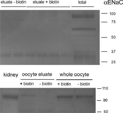 Figure 4. Biotinylation of αENaC in kidneys and oocytes. Top: kidneys from rats on a low-Na diet were perfused with or without biotin. Lanes were loaded with 40 μg of total membrane protein or 25 μl of eluate from the neutravidin beads. Total membranes from whole kidney had three stained bands at ∼90, ∼65, and ∼30 kD. Only the 30-kD band was observed in eluates from neutravidin beads, but staining was similar in biotinylated and nonbiotinylated kidneys, indicating nonspecific binding to neutravidin beads. Bottom: The major peptide in ENaC-expressing oocytes is the full-length 90-kD form. Faint staining of material at this molecular mass was observed in the eluate of biotinylated but not of nonbiotinylated oocytes, showing that the protein can react with the biotin reagent. Similar results were obtained with three independent batches of oocytes. The 30-kD peptide could not be resolved due to nonspecific staining of an unidentified protein (not depicted).