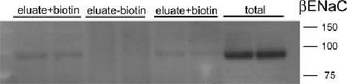 Figure 5. Biotinylation of βENaC. Kidneys from rats on a low-Na diet were perfused with or without biotin. Lanes were loaded with 40 μg of total membrane protein or 20 μl of eluate from the neutravidin beads. Total membranes from whole kidney had a predominant stained band at ∼90 kD. Fainter staining at the same molecular mass was observed in eluates from biotinylated kidneys. No staining was detected in eluates from nonbiotinylated kidneys.