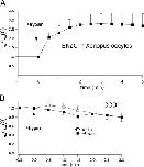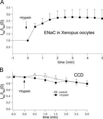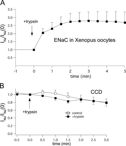 Figure 7. Effects of trypsin on Na+ channel activity. Current–voltage relationships were generated under voltage-clamp conditions at 30-s intervals. Trypsin (3 μg/ml) was added to the bath at t = 0. Currents at −100 mV were corrected for leak current measured in the presence of 10 μM amiloride and normalized to values at t = 0. (A) Xenopus oocytes. Oocytes expressing rat αβγENaC were preincubated in low-Na solution and superfused with 110 mM Na solution. Currents were measured by two-electrode voltage clamp. Data represent means ± SEM for five oocytes. (B) Rat CCD. Whole-cell currents were measured in principal cells from the CCDs of rats maintained on a low-Na diet for 1 wk. Currents for trypsin treated (filled squares) and time controls (open squares) are plotted. Data represent means ± SEM for 13–14 cells.
