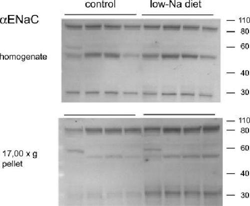 Figure 8. Effect of low-Na diet on αENaC expression in the homogenate and in the intermediate 17,000 g membrane pellet of the kidney enriched in surface membranes. Each lane represents 60 μg protein from an individual animal. The expression of the 30-kD fragment was consistently increased by Na depletion, particularly in the intermediate pellet.