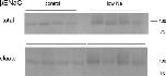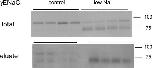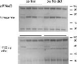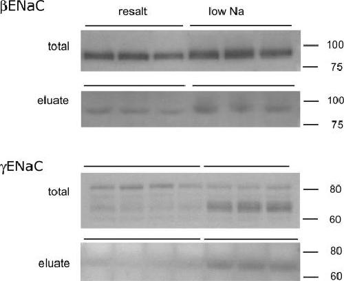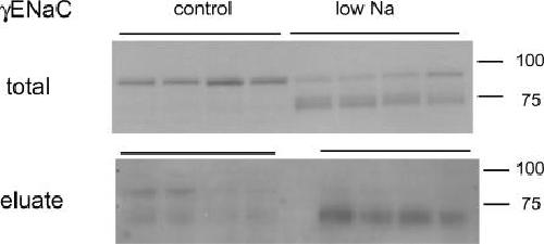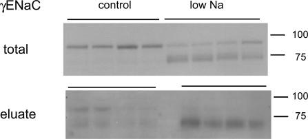 Figure 10. Effects of low-Na diet on γENaC expression in total membranes and in biotin-neutravidin eluates. Each lane was loaded with 75 μg total membrane protein or 25 μl eluate. The staining of low molecular mass peptide was increased, while that of the higher molecular mass peptide was decreased by Na depletion.