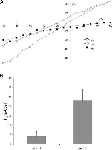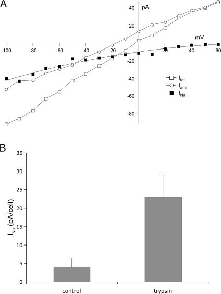 Figure 11. Effect of trypsin on Na-channel activity in CCD from Na-replete rats. (A) Whole-cell current–voltage relationships of a principal cell from a CCD from a rat maintained on control chow. The tubule was superfused with solution containing 3 μg/ml trypsin. Currents were obtained in the absence (open squares) and presence (open circles) of amiloride. Filled squares represent the amiloride-sensitive current (INa). (B) INa measured at −100 mV in the presence and absence of trypsin. Data represent means ± SEM for 14 and 13 cells, respectively.