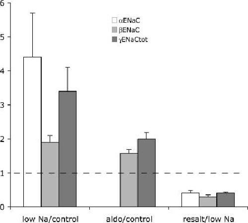 Figure 14. Summary of effects of low Na diet, aldosterone infusion, and acute Na repletion on surface expression of ENaC. Data are plotted as ratios of densities for two conditions and represent means ± SEM for four to eight measurements under each pair of conditions. The αENaC subunit was not analyzed for the aldosterone vs. control conditions. All ratios were significantly different from one (P < 0.05).