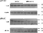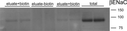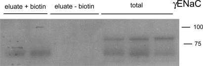 Figure 6. Biotinylation of γENaC. Kidneys from rats on a low-Na diet were perfused with or without biotin. Lanes were loaded with 40 μg of total membrane protein or 20 μl of eluate from the neutravidin beads. Total membranes from whole kidney had two predominant stained bands at ∼85 and ∼65 kD. Staining of the lower but not the higher molecular mass band was observed in eluates from biotinylated kidneys. No staining was detected in eluates from nonbiotinylated kidneys.