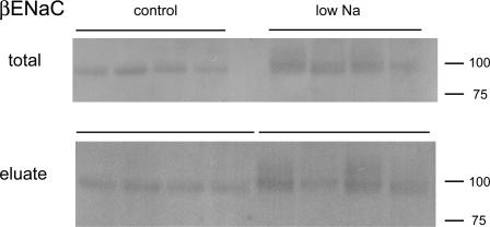 Figure 9. Effect of low-Na diet on βENaC expression in total membranes and in biotin-neutravidin eluates. Each lane was loaded with 75 μg total membrane protein or 25 μl eluate. The expression of the major 90-kD peptide was consistently increased by Na depletion. The staining of more slowly migrating protein, presumably corresponding to glycosylated peptides, was also enhanced.