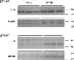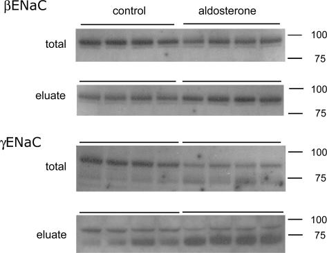 Figure 12. Effects of aldosterone infusion on β and γENaC expression in total membranes and in biotin-neutravidin eluates. Each lane was loaded with 45 μg total membrane protein or 20 μl eluate. Top: staining of the major band of βENaC was slightly decreased in the total membranes but increased in the surface pool of aldosterone-treated animals. Bottom: staining of the lower molecular mass form of γENaC was increased in both the total membranes and in the surface pool.