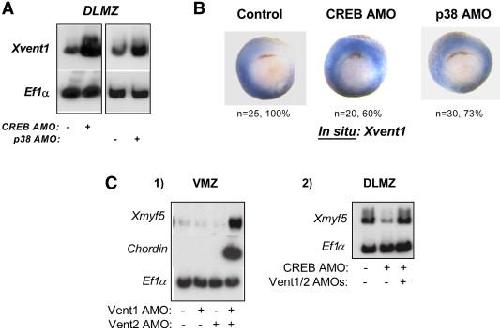 Fig. 6. p38/CREB and Vents antagonize in mesoderm patterning. (A) Embryos were injected with either p38 AMO or with CREB AMO, DLMZ explants (n = 18) were dissected and cultured until sibling embryos reached stage 13. Total RNA was isolated and RT PCR analysis was performed. (B) Embryos were injected with CREB AMO or with p38 AMO. Vent1was detected by whole mount in-situ hybridization performed on stage 10.25 embryos. (C) 1; Vent1 and vent2 AMOs were injected, separately or combined, to embryos. VMZ explants were dissected at stage 10.25 and cultured until sibling embryos reached stage 14. Total RNA was isolated and RT PCR analysis was preformed. 2; CREB AMO was injected without or with a mixture of vent1 and vent2 AMOs to embryos. DLMZ explants were dissected at stage10.25 and cultured until sibling embryos reached stage 14. Total RNA was isolated and RT PCR analysis was preformed.