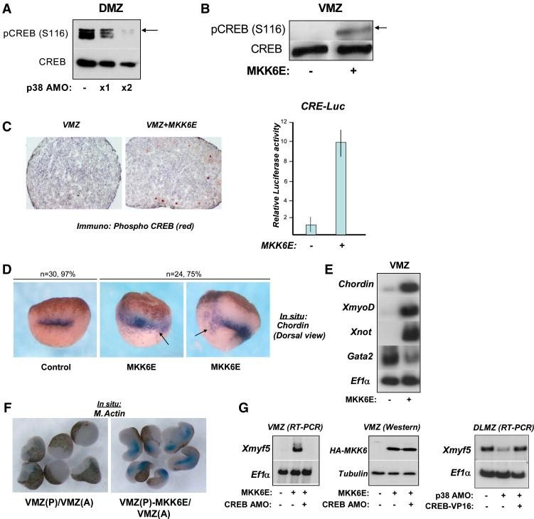 Fig. 4. The p38 pathway affects CREB phosphorylation and activity. (A) Two concentrations of CREB AMO (7 and 14 ng) were injected to embryos. DMZ explants (n = 10) were dissected at stage 10.25. Proteins were extracted and analyzed by Western blotting using anti phospho CREB antibody followed by anti total CREB antibody. (B) Embryos were injected with transcripts encoding MKK6E. VMZ explants (n = 10) were dissected at stage 10.25 and cultured until sibling embryos reached stage 14. Proteins were analyzed as in panel A. (C) Transcripts of MKK6E (100 pg) were injected into one cell embryos (n = 3). VMZ explants were isolated (10.25). Explants were fixed at stage 14, sectioned and immunostained with antibodies to phospho CREB (left panel). A pTal-CRE-Luc reporter gene was injected to one cell embryos without or with transcripts encoding MKK6E. VMZ explants (n = 18) were isolated at stage 10.25 and were grown to stage 13. Proteins were extracted and used to assay luciferase activity. The values are the average of three experiments (right panel). (D) MKK6E transcripts were injected to ventral blastomeres of four cell embryos. In situ hybridization was performed at stage 10+ embryos with a probe to chordin. (E) Transcripts encoding MKK6E were injected to embryos. VMZ explants (n = 18) were isolated and were grown to stage 15. Total RNA was isolated and RT-PCR analysis was performed. (F) Pigmented embryos were injected with transcripts encoding MKK6E. VMZ explants (P) were isolated and conjugated with VMZ explants from albino embryos (A). Conjugates were grown to stage 15 and in situ hybridization was performed with a probe to muscle actin. VMZ conjugates from uninjected embryos were used as negative controls. (G) Embryos were injected with transcripts encoding MKK6E without or with CREB AMO (n = 18). VMZ explants were dissected at stage 10.25 and cultured until sibling embryos reached late gastrula stages. Left: RNA was isolated and RT-PCR was performed. Middle: Protein extracts were prepared and ectopic MKK6 was identified in Western analysis (anti HA). Right: In a second experiment, embryos were injected with p38 AMO without or with transcripts encoding CREB-VP16 (n = 18). VMZ explants were isolated as above and RT-PCR was performed.