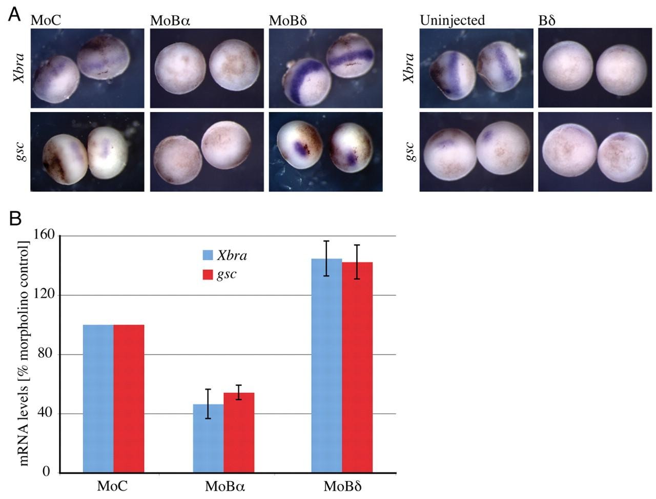 Fig. 2. Manipulating the expression of Bα and Bδ in Xenopus embryos has opposing effects on Activin/Nodal target gene expression. (A) In situ hybridisation of gastrula-stage embryos injected with either a morpholino control (MoC) or a specific morpholino against Xenopus Bα (MoBα) or Bδ (MoBδ), or with Flag-tagged mouse Bδ mRNA (Bδ) at the one-cell stage. The probes used were against gsc or Xbra. Staining was visualised with BM purple. There is increased staining for both Xbra and Gsc in Bδ morphants, and decreased staining in Bα morphants and embryos overexpressing Bδ. (B) Analysis of gene expression by q-PCR. Total RNA was isolated from stage 10.5 embryos that had been injected at the one-cell stage with either morpholino control, or morpholinos against Bα or Bδ. Expression levels are normalised to ornithine decarboxylase (ODC).