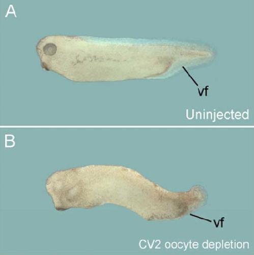 Figure S2. Maternal Injection of CV2 MO into Xenopus tropicalis Oocytes (A) Uninjected embryo at stage 33. (B) The CV2 MO oocyte injection phenotype does not differ from the one obtained when embryos are injected at 2-cell stage. Note the reduction in the ventral fin (vf), which indicates a pro-BMP function for endogenous CV2. This experiment indicates that there is no significant maternal contribution to the CV2 phenotype in Xenopus. |