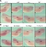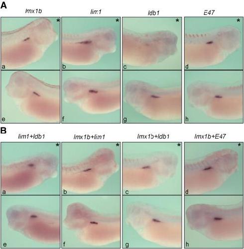Fig. 6. Over-expression of lmx1b and its potential binding partners affects nephrin expression. mRNAs of lmx1b and its potential binding partners were injected either alone (panel A) or in combination (panel B), together with lacZ, into one cell of 2-cell embryos. Red Gal staining followed by nephrin in situ hybridisation was carried out at stage 33/34 in order to assess any glomus phenotype. For each embryo, the injected side (indicated by an asterisk, panels aâd) was compared to the uninjected side (panels eâh). Injection of lmx1b mRNA alone did not induce any significant change in nephrin staining (A, compare panel a to e), whereas injection of lim1 or ldb1 alone resulted in the formation of an enlarged and reduced nephrin domain respectively (A, b and f; A, c and g). These phenotypes can be partially rescued by the co-injection of lmx1b (B, b and f; B, c and g). Co-injection of lim1 and ldb1 rescued both phenotypes, the embryos displayed on the injected side a nephrin domain, similar in area to the uninjected side (B, a and e). Injection of E47 alone or in combination with lmx1b did not induce any statistically significant phenotype (A, d and h and B, d and h).