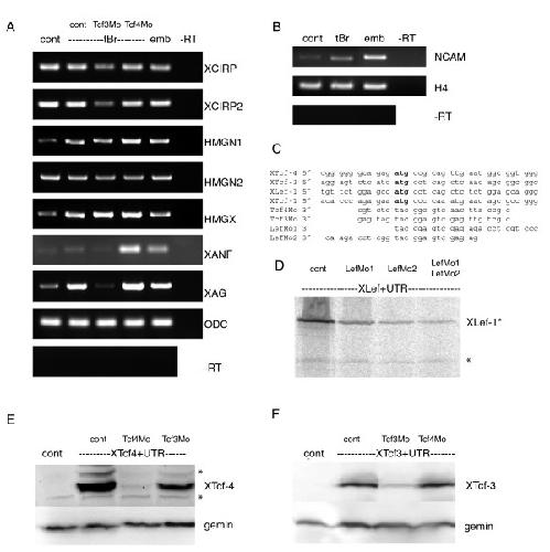 Figure 1. XCIRP is regulated by XTcf-3, but not by XTcf-4. (A) RT-PCR on sibling embryos (emb), animal cap explants of naive animal caps (cont), neuralized animal caps (tBr, cont) and neuralized animal caps coinjected with truncated BMP receptor (tBr) and the indicated morpholino (Tcf3Mo: XTcf-3 specific antisense morpholino oligonucleotide, Tcf4Mo: XTcf-4 specific antisense morpholino oligonucleotide) revealed that following XTcf-3 depletion, the expression of XCIRP and XCIRP2, as well as the cement gland specific marker gene XAG is robustly downregulated. The expression of HMGN1, HMGN2 and HMGX is not regulated in a Tcf-subtype specific manner. ODC shows the amplification of the house keeping gene ornithine decarboxylase, -RT is the control amplification of not reverse transcribed RNA. (B) RT-PCR on sibling embryos (emb), animal cap explants of naive animal caps (cont) and neuralized animal caps (tBr) demonstrate that the pan-neural marker gene NCAM is induced by injection of 100 pg mRNA encoding for truncated BMP receptor (tBr). H4 shows the amplification of the house keeping gene histone 4, -RT is the control amplification of not reverse transcribed RNA. (C) Sequence alignment of the Lef/Tcf specific antisense morpholino oligonucleotides together with the corresponding mRNAs, start codons of the Lef/Tcfs are indicated in bold. Tcf4Mo: XTcf-4 specific antisense morpholino oligonucleotides, Tcf3Mo: XTcf-3 specific antisense morpholino oligonucleotides, LefMo1 and LefMo2: XLef-1 specific antisense morpholino oligonucleotidess. (D-F) Specificity of the Lef/Tcf morpholinos towards their target mRNA, (D) reduction of in vitro translated S-35 labelled XLef-1 protein in the presence of the indicated morpholinos, The asterisk marks an unspecific band. (E) reduction of injected C-terminally myc-tagged XTcf-4 by coinjection of ten picomoles Tcf4Mo, but not two picomoles Tcf3Mo. The asterisks indicate unspecific staining. Gemin staining was used as loading control. (F) reduction of injected C-terminally myc-tagged XTcf-3 by coinjection of two picomoles Tcf3Mo, but not ten picomoles Tcf4Mo. Gemin staining was used as loading control.