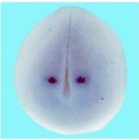 tcf7l2 (transcription factor 7-like 2) gene expression in Xenopus laevis embryo, assayed via in situ hybridization, NF stage 17, anterior view, dorsal up.