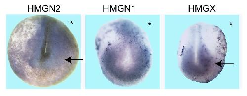 Additional File 3. Depletion of XTcf-3 has minor effects on the expression of HMG-box genes. Depletion of XTcf-3 by injection of two picomoles morpholino (Tcf3Mo): 5'-cgctgttgagctgaggcatgatgag-3' (directed against BC077764) into one blastomere of 2-cell stage embryos (the injected side is indicated by an asterisk) has only minor effects on the expression of HMGN1, HMGN2 and HMGX. While HMGN2 and HMGX are laterally expanded (arrow), HMGN1 remains unchanged. Probes for in situ hybridization are as described: HMGN1 and HMGN2 [1], HMGX [2].