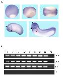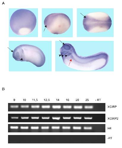 Additional File 2. Expression of XCIRP during early embryogenesis. (A) Spatial expression of XCIRP during early development as revealed by in situ hybridization. The arrows indicate high expression of XCIRP in neural tissue. Arrowheads point to the expression in the branchial arches. The red arrow indicates staining of the pronephros. The open reading frame of XCIRP was amplified using the following primers: XCIRPstart: 5'-tcagaattcaatgtctgacgaaggaaaact-3' and XCIRPstop 5'-cttctcgagttactcgtgtgtagcatagctg-3' and sub-cloned into pGEMT for creating labeled antisense RNA. (B) Temporal expression of XCIRP and XCIRP2 as revealed by RT-PCR. H4 indicates the amplification of the house keeping gene histone 4, -RT the amplification of H4 in samples, which have not been reverse transcribed. The following primer pairs were used: histone 4: 5'-cgggataacattcagggtatcact-3' and 5'-atccatggcggtaa ctgtcttctt-3'; XCIRP: 5'-gctgatcaggcggggccacc-3' and 5'-gcacccaggctctgtcctgc-3'; XCIRP2: 5'-ccattcaggctgatcagg-3' and 5'-ctggagagagacgaacac-3'.