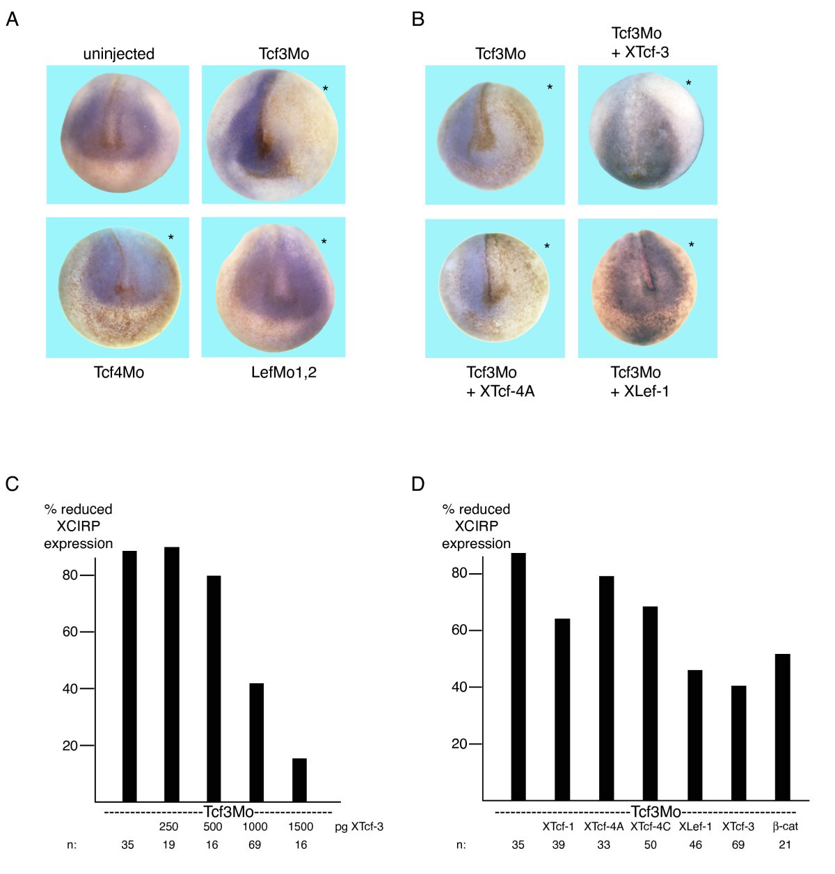 Figure 4. XCIRP is a Tcf-subtype specific target gene. (A) Anterior view of in situ hybridization reveals that depletion of XTcf-3 by morpholino injection (Tcf3Mo), but not depletion of XTcf-4 (Tcf4Mo) or XLef-1 (LefMo1,2) results in an absence of XCIRP staining at the injected side (asterisk). (B) XCIRP expression in Tcf3Mo injected embryos can be restored by co-injection of XTcf-3 and XLef-1 mRNA. The asterisks mark the injected side. (C, D) The rescue of XCIRP expression by XTcf-3 is dose dependent and Tcf-subtype specific. In (C): the indicated amount of N-terminal myc tagged XTcf-3mRNA was co-injected with two picomoles of Tcf3Mo. In (D): 1000 pg of the indicated Lef/Tcf mRNA or 300 pg β-catenin mRNA were coinjected with two picomoles of Tcf3Mo. Given is the percentage of embryos showing reduced or absent XCIRP expression at the injected side. n: number of analyzed embryos.