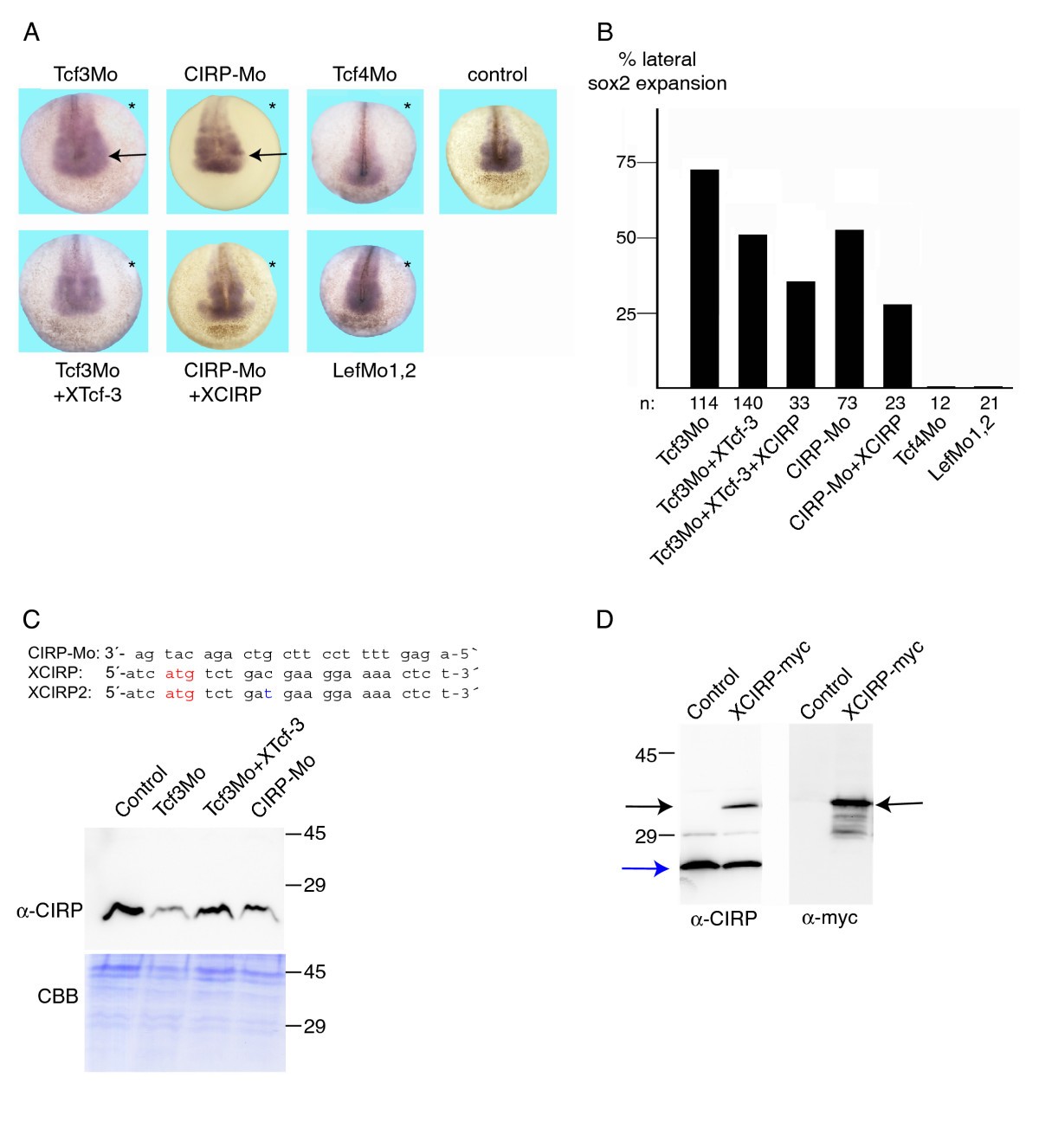 Figure 5. Depletion of XTcf-3 and XCIRP results in a lateral expansion of sox2. (A) In situ hybridization revealed that both, XTcf-3 and XCIRP are required for proper neural development. The expression of sox2 was laterally expanded (arrow) at the injected side (asterisk). Two picomoles Tcf3Mo, eight picomoles Tcf4Mo or two picomoles CIRP-Mo or two picomoles LefMo1 + two picomoles LefMo2 were coinjected with 4 pg dextrane (to trace the injected side) and 1000 pg XTcf-3 mRNA or 200 pg XCIRP DNA into one blastomere of 2-cell stage embryos. (B) Quantification of the lateral expansion. 71,2% of the Tcf3Mo, 51,5% Tcf3Mo+XTcf-3, 36% Tcf3Mo+XTcf-3+XCIRP, 53% of the CIRP-Mo and 30% of the CIRP-Mo+CIRP and 0% of the Tcf4Mo and LefMo, injected embryos showed a lateral expansion of sox2. n: number of analyzed embryos. (C) The alignment of the XCIRP antisense morpholino oligonucleotide (CIRP-Mo) with XCIRP and XCIRP2 indicates that it is supposed to block both isoforms. The Western Blot demonstrates that the amount of endogenous XCIRP protein is reduced following CIRP-Mo injection. The reduction of XCIRP protein by blocking XTcf-3 translation (Tcf3Mo) can be restored by co-injection of XTcf-3 mRNA (Tcf3Mo + XTcf-3). Two picomoles CIRP-Mo, two picomoles Tcf3Mo and two picomoles Tcf3Mo + 1000 pg XTcf-3 mRNA were injected into both blastomeres of 2-cell stage embryos. RIPA lysates corresponding two 1/3 embryo where separated on a 15% SDS page and either stained with coomassie (CBB) as loading control or transferred to nitrocellulose and stained with anti-CIRP polyclonal antiserum (α-CIRP).(D) The anti-CIRP polyclonal antiserum (α-CIRP), originally directed against XCIRP2 [18] recognizes both, endogenous XCIRP/XCIRP2 (blue arrow) and overexpressed XCIRP (black arrow). Staining with the anti-myc antibody shows the overexpressed myc-tagged XCIRP (black arrow) and some faster migrating proteins, which correspond most likely to degradation products.