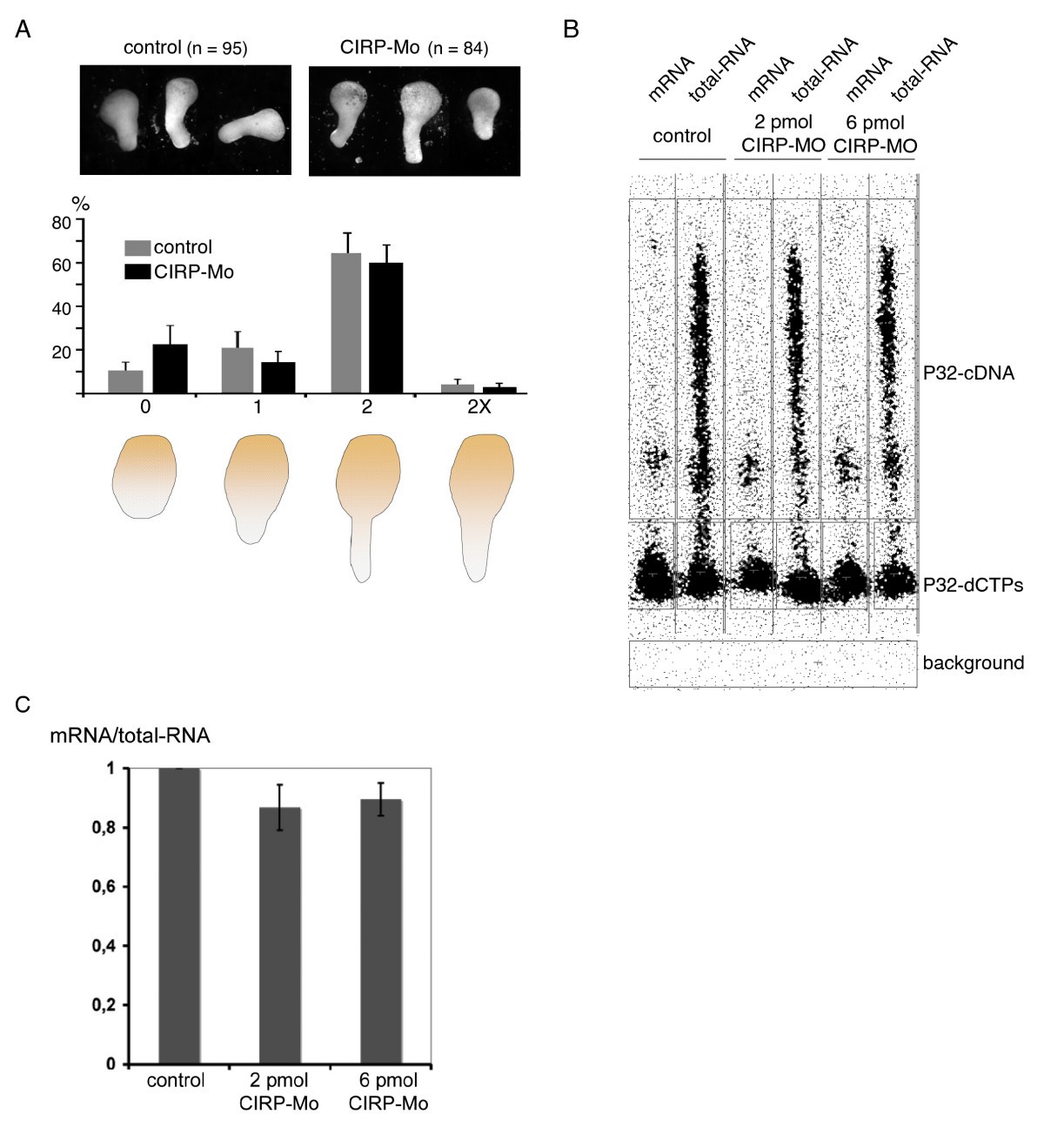 Figure 6. Depletion of XCIRP causes reduction of mRNA. (A) XCIRP is not necessary for convergent extension movements. Similar to dorsal animal zone explants of control embryos, more than 60 percent of the explants of CIRP-Mo injected embryos elongate. 0 and 1 indicate non-elongated explants, 2 indicate elongated and restricted explants and 2X elongated, but not constricted explants according to Schambony and Wedlich [27]. (B, C) Depletion of XCIRP results in a reduction of mRNA. Total RNA of stage 16 embryos was reverse transcribed either with oligo dT primer (mRNA) or random hexamer primer (total RNA) in the presence of 60 μCi P32 α-dCTP. (B) Shows an autoradiograph of a representative gel with a smear of labeled cDNA, the free radioactive nucleotides and the background. (C) The signals were quantified by setting the relation of mRNA/total RNA for the control as 1. Shown is the average and standard error for 3 independent experiments.