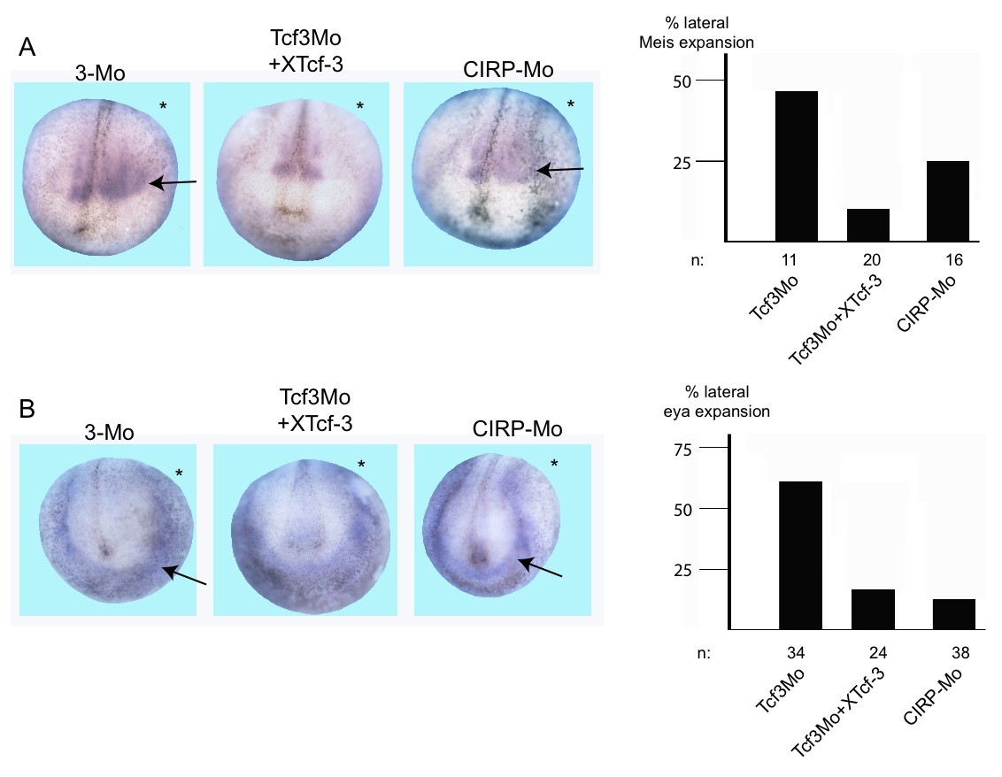 Additional File 4. Depletion of XTcf-3 and XCIRP results in a lateral shift of the neuroectodermal border. (A) Lateral expansion (arrows) of Meis3, (B) lateral shift (arrows) of eya1 expression following unilateral injection of two picomoles XTcf-3 morpholino (Tcf3Mo), XTcf-3 morpholino together with 1000 pg XTcf-3 mRNA (Tcf3Mo + XTcf-3) or two picomoles XCIRP-morpholino (CIRP-Mo: 5'-agtacagactgcttccttttgaga-3'). The asterisks mark the injected side. The quantification gives the percentage of embryos showing lateral expansion of Meis3 (A) or shift of eya1 (B). N gives the number of analyzed embryos. Probes for in situ hybridization are as described [3].
