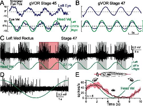 VOR behavior and extraocular nerve discharge of larval Xenopus in response to horizontal axis rotation. A, B, Larval Xenopus exhibit a robust gVOR to dynamic rotation (0.125 Hz; ±10°/s) in the horizontal (roll) plane at stage 45 (A) that becomes more refined by stage 47 (B). C, D, Suction electrode recording of the nerve innervating the left medial rectus in a stage 47 animal demonstrates a strong modulation in motor neuron activity during horizontal axis rotation in the roll plane. One cycle of the recording shown in C at an extended time scale is shown in D. E, Averaged response ± SD (red area) to horizontal axis rotation from five stage 47 larvae show discharge modulation correlated with head velocity. Pos, Position; Vel, velocity; Med, medial.