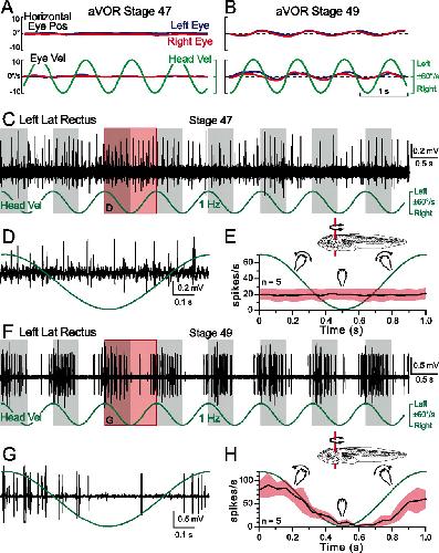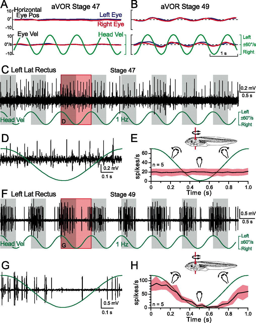 VOR behavior and extraocular nerve discharge of larval Xenopus in response to vertical axis rotation. A, A stage 47 larvae did not exhibit any behavioral response during angular acceleration stimulation in the vertical axis (1 Hz; ±400°/s2). B, Only by stage 49 did Xenopus larvae demonstrate a reliable aVOR during angular acceleration stimulation. CâH, Compatible with the behavior, the activity of the abducens nerve innervating the left lateral rectus in a stage 49 (FâH) but not in a stage 47 (CâE) Xenopus was modulated in response to the same stimuli. D, G, One cycle of the recordings in C and F, respectively, at an extended time scale; the average ± SD (red area) of five animals over 30 cycles is summarized in E and H, respectively. Pos, Position; Vel, velocity; Lat, lateral.
