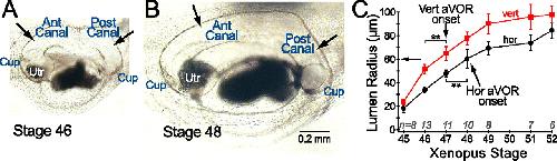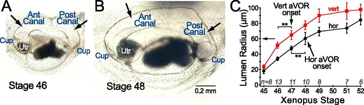 Photomicrographs of the left otic capsule from stage 46 and 48 Xenopus larvae. A, B, Lateral view of the anterior (Ant) and posterior (Post) vertical canals in left otic capsule. Black arrows indicate location where canal lumen radii were measured. C, Plot of vertical canal lumen radius (anterior and posterior canals combined) and horizontal lumen radius (mean ± SD) at different developmental stages before and after aVOR onset. Canal lumen radii before and after horizontal aVOR onset (stage 47 and 48) and before and after vertical aVOR onset (stage 46 and 47) were significantly different (**p ⤠0.01; MannâWhitney U test); numbers of specimens used for the analysis at each stage are indicated in C. Other abbreviations are the same as in Figure 1.