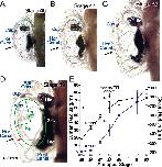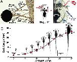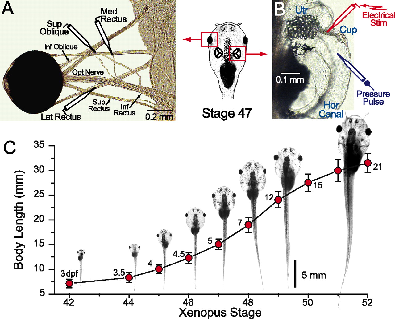 Schematic depicting locations of nerve recording and electrical and pressure stimulation sites in the labyrinth in larval Xenopus. A, B, The activity of motor nerves innervating extraocular muscles were recorded with suction electrodes (A) after either electrical stimulation (Stim) of an identified semicircular canal nerve or displacement of the canal cupula (Cup) by pressure injection of endolymph Ringer's solution, e.g., into the horizontal (Hor) canal (B). C, Graph of body length (mean ± SD) versus developmental stage according to Nieuwkoop and Faber (1994). Superimposed on the graph is a photomontage of larval Xenopus from stages 42â49 showing the significant change in length and head size with age. The peak growth in larval size occurs between stages 46 and 49. Adjacent to each marker on the graph are the ages of the larvae in days postfertilization. Inf, Inferior; Lat, lateral; Med, medial; Opt, optic; Sup, superior; Utr, utricle.