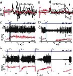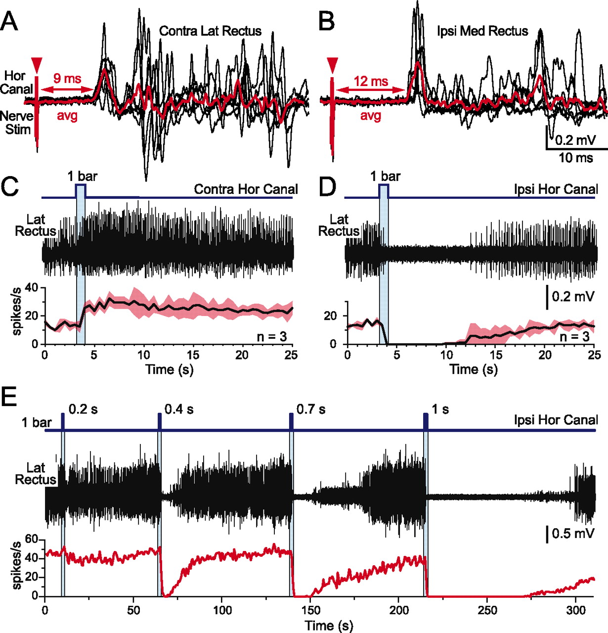 Electrical and pressure activation of horizontal canal afferent responses in stage 47 Xenopus larvae. A, B, Electrical stimulation of the horizontal canal nerve triggered spike activity in both the contralateral (Contra) lateral rectus (A) and ipsilateral (Ipsi) medial rectus nerves (B) as observed in six superimposed single sweep responses. Averaged responses (red) demonstrate a 3 ms difference between response onset in the two nerves. C, D, Lateral rectus nerve activity transiently increased (C) after a brief (1 s) pressure pulse into the contralateral horizontal canal and was inhibited (D) after a pressure pulse into the ipsilateral horizontal canal; mean (n = 3) ± SD (red area). E, Lateral rectus nerve activity exhibited a graded inhibitory response to increasingly longer pressure pulses into the ipsilateral horizontal canal. In all cases, neural activity returned to baseline levels suggesting the cupula was not damaged by the stimulus. Other abbreviations are the same as in Figure 1. Data in AâD are from the same animal.