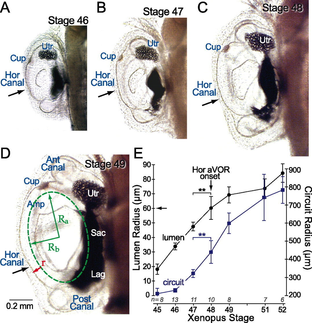 Semicircular canals increase in size during Xenopus larval development. AâD, Photomicrographs of the left otic capsule, viewed dorsally from developmental stages 46â49, illustrate the increase in dimensions of the horizontal semicircular canal. Black arrows in AâD indicate the location where the canal lumen radii were measured. Superimposed in D is a schematic illustrating the parameters used to determine circuit and lumen radii. E, Plot of horizontal canal lumen and circuit radius (mean ± SD) at different developmental stages before and after aVOR onset. Parameters before (stage 47) and after aVOR onset (stage 48) were significantly different (**p ⤠0.01, MannâWhitney U test); numbers of specimens used for the analysis at each stage are indicated in E. The scale bar in D applies to AâC. Ant, Anterior; Amp, ampulla; Lag, lagena; Ra, Rb, large and small axes of canal circuit radius, respectively; r, radius of canal lumen; Sac, saccule. Other abbreviations are the same as in Figure 1.