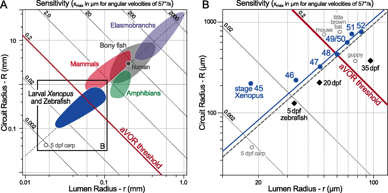Plots of mean canal lumen radius (r) versus mean canal circuit radius (R) of the horizontal canals of larval Xenopus and zebrafish. A, Superimposed are canal dimensions for selected classes of vertebrates adapted from the study by Muller (1999). Oblique lines represent theoretical endolymph displacement in micrometers for a given angular velocity (1 radian/s or 57.3°/s) and the dashed gray line is the regression line of r = 38.9 × r1.60 all as calculated by Muller (1999). B, The solid blue line is the regression line of r = 42.2 × r1.59 for stage 47–52 larvae. Measurements for the horizontal canal lumen and circuit radii for larval zebrafish and mouse are from previous studies [5, 20 dpf (Bever and Fekete, 2002); 35 dpf and behavior (Beck et al., 2004b); mouse (Calabrese and Hullar, 2006)]. The mouse lumen radius is shown at its smallest estimated size. For stage 48 Xenopus, the horizontal aVOR rises above threshold for the first time and becomes fully active at stage 49. Based on the behavioral response of Xenopus and zebrafish larvae, the oblique solid red line is a generalized sensitivity threshold for vertebrate aVOR behavior for this stimulus.