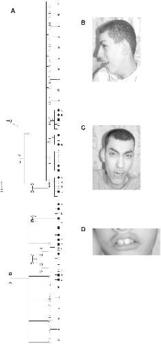 (A) Partial pedigree and segregation analysis of the affected family. The numbers denote individuals whose DNA samples were analyzed. Haplotypes are represented as columns of numbers; the disease-associated haplotype is shaded. Physical distances between the markers are shown.