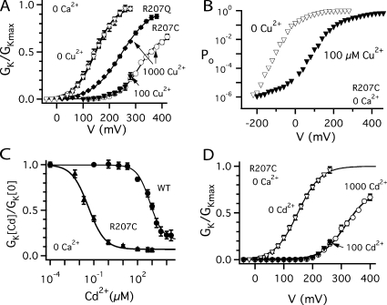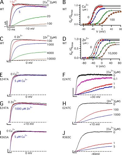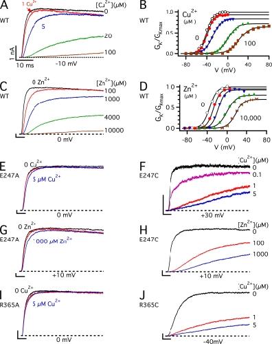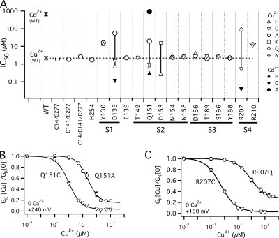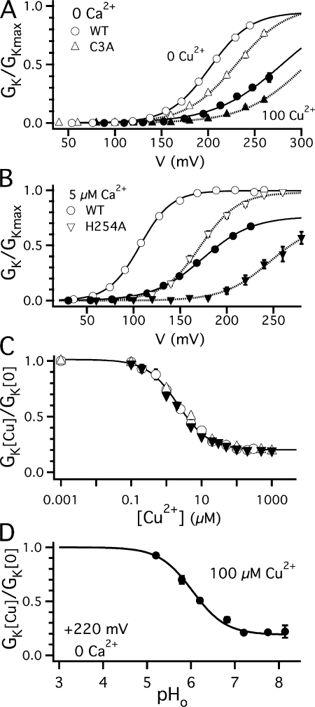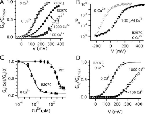 Copper is an essential trace element that may serve as a signaling molecule in the nervous system. Here we show that extracellular Cu2+ is a potent inhibitor of BK and Shaker K+ channels. At low micromolar concentrations, Cu2+ rapidly and reversibly reduces macrosocopic K+ conductance (G(K)) evoked from mSlo1 BK channels by membrane depolarization. GK is reduced in a dose-dependent manner with an IC50 and Hill coefficient of 2 microM and 1.0, respectively. Saturating 100 microM Cu2+ shifts the GK-V relation by +74 mV and reduces G(Kmax) by 27% without affecting single channel conductance. However, 100 microM Cu2+ fails to inhibit GK when applied during membrane depolarization, suggesting that Cu2+ interacts poorly with the activated channel. Of other transition metal ions tested, only Zn2+ and Cd2+ had significant effects at 100 microM with IC(50)s > 0.5 mM, suggesting the binding site is Cu2+ selective. Mutation of external Cys or His residues did not alter Cu2+ sensitivity. However, four putative Cu2+-coordinating residues were identified (D133, Q151, D153, and R207) in transmembrane segments S1, S2, and S4 of the mSlo1 voltage sensor, based on the ability of substitutions at these positions to alter Cu2+ and/or Cd2+ sensitivity. Consistent with the presence of acidic residues in the binding site, Cu2+ sensitivity was reduced at low extracellular pH. The three charged positions in S1, S2, and S4 are highly conserved among voltage-gated channels and could play a general role in metal sensitivity. We demonstrate that Shaker, like mSlo1, is much more sensitive to Cu2+ than Zn2+ and that sensitivity to these metals is altered by mutating the conserved positions in S1 or S4 or reducing pH. Our results suggest that the voltage sensor forms a state- and pH-dependent, metal-selective binding pocket that may be occupied by Cu2+ at physiologically relevant concentrations to inhibit activation of BK and other channels.