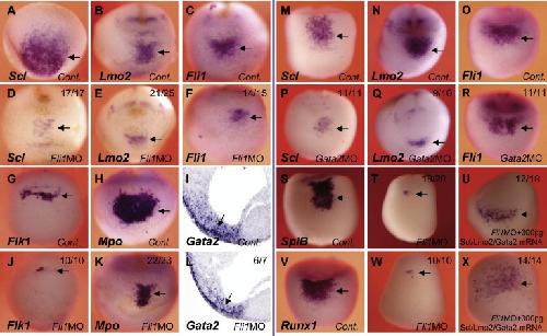 Figure 1. Fli1 Is Required Upstream of Gata2 for the Primitive Hemangioblast Program(AâL) Fli1 requirement for the primitive hemangioblast. Xenopus embryos injected with Fli1 MO in the DMZ at the 4-cell stage were processed for in situ hybridization at stage 17, either as whole mounts (WISH) (AâH, J, K) or as sections (I, L).(MâX) Gata2 morphants and rescue experiments confirm that Fli1 is at the top of the primitive hemangioblast hierarchy. Gata2 MOs were injected into the DMZ at the 4-cell stage and embryos were processd for WISH at stages 16/17. Expression of SpiB (SâU) and Runx1 (VâX) was partially rescued by coinjection of mRNA for Scl, Lmo2, and Gata2.Arrows mark the primitive hemangioblast population. Proportion of embryos with phenotype shown indicated in top right corner.