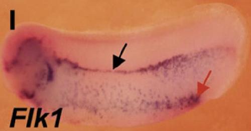 kdr (kinase insert domain receptor (a type III receptor tyrosine kinase)) gene expression in Xenopus laevis embryo, assayedvia in situ hybridization, NF stage 24, lateral view, anterior left, dorsal up.