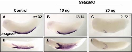 A 1:1 mix of Gata2A and Gata2B MOs was injected into two ventral blastomeres at the 8 cell stage, the embryos were grown to stage 32 and probed for αT4globin expression by in situ hybridisation. A total of 10, 25 and 50 ng was used. 25 ng was optimal (C,F) compared to controls (A,D) and 50ng was toxic (data not shown). A-C, lateral views, D-F ventral views.