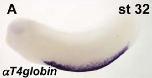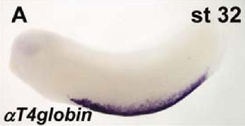 hba4 (alpha-T4 globin) gene expression in Xenopus laevis embryo, assayed via in situ hybridization, NF stage 32, lateral view, anterior left, dorsal up.