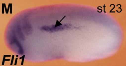 fli1 (Fli-1 proto-oncogene, ETS transcription factor) gene expression in Xenopus laevis embryo, assayed via in situ hybridization, NF stage 23, lateral view, anterior left, dorsal up.
